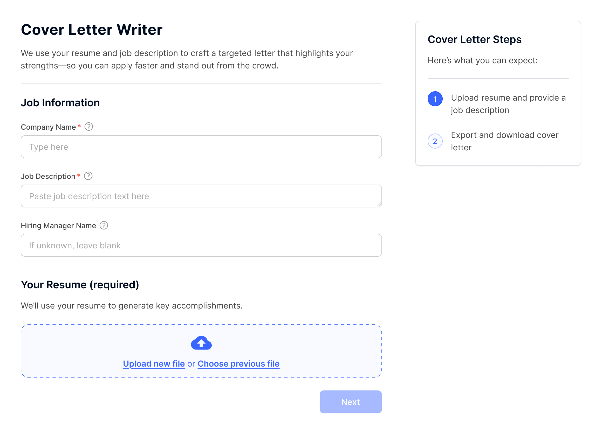 Use the Cover Letter Writer to quickly create a custom cover letter that matches any job posting. If you don’t have a specific role in mind, you can still generate a strong, general-purpose cover letter using your resume and background. Everything else is optional.