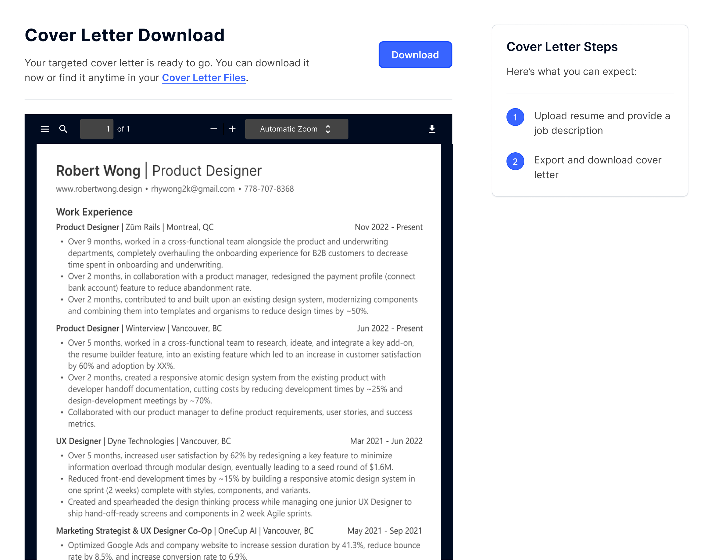 Once you're done reviewing your cover letter, you can view your cover letter and download or export it in your preferred format. Now it’s ready to share with employers or tailor further for other roles.