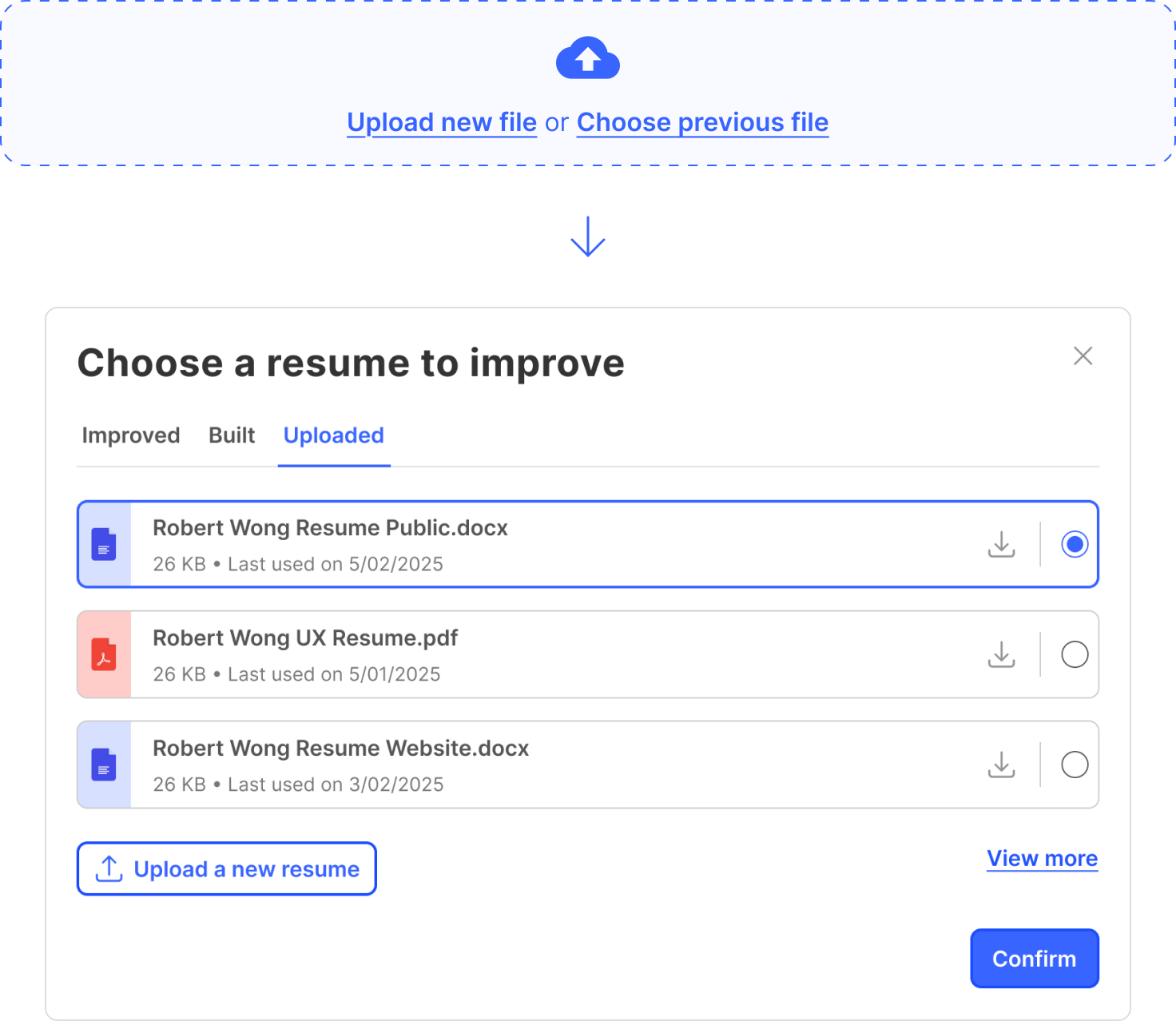 You can start by uploading a new resume, or choose from your previously uploaded or improved resumes. This makes it easy to pick up where you left off or apply new improvements to an existing version.