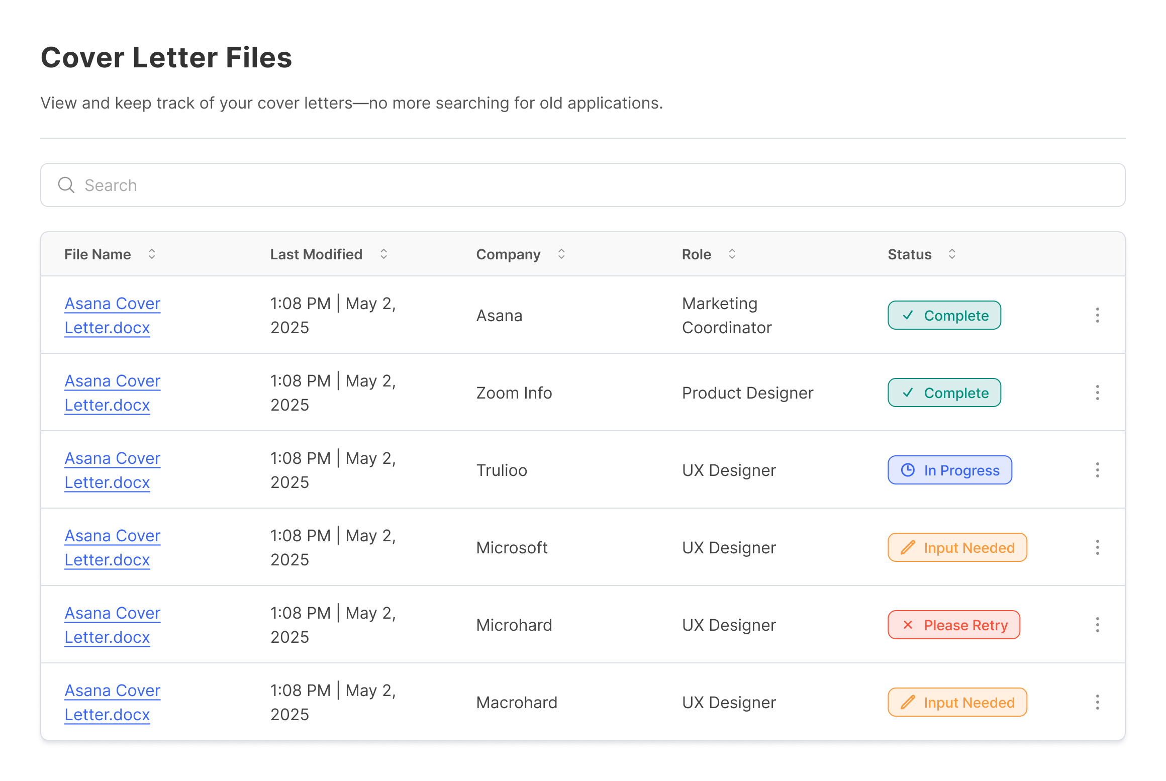 You can view all your files from both the Cover Letter features. Every version you’ve worked on is saved, and you can download any past file whenever you need it.
